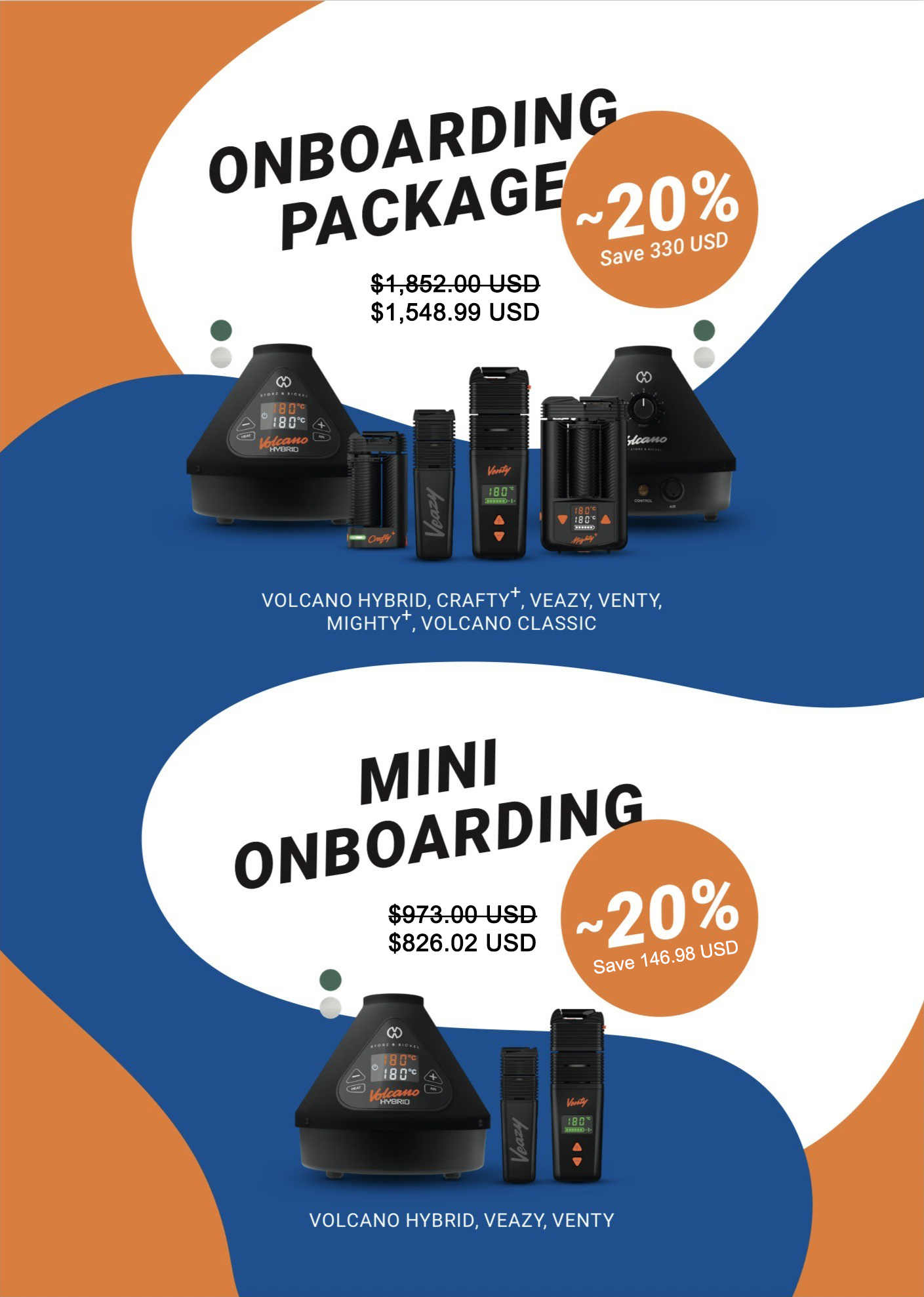Onboarding Package: Order the Volcano Hybrid, Crafty+, Veazy, Venty, Mighty+, and Volcano Classic to save $330.01 (Coupon Code: SBOB)
